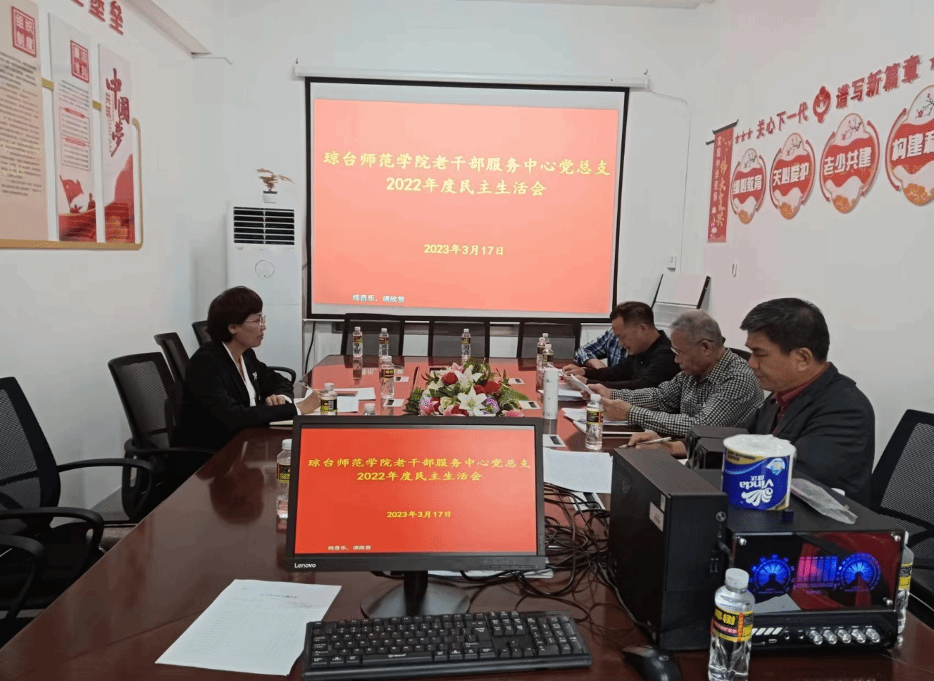 2023年3月17日下午,ok138电子官方网站老干部服务中心党总支召开2022年度民主生活会,党总支书记陈道昭、支部委员周经奉、王立紫、冼若兴参加会议,校党委委员、副书记陈晖阳同志到会指导点评。